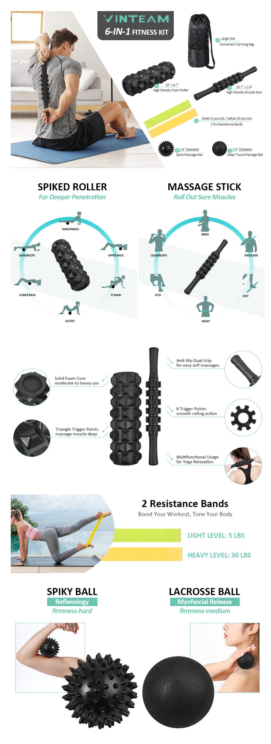 Foam Roller Set, VinTeam 6 in 1 Muscle Massage Roller Set with Foam Roller, Massage Roller Stick, Fascia Ball, Massage Spike Ball, Resistance Bands, Perfect for Yoga Pilates, Deep Tissue Massage